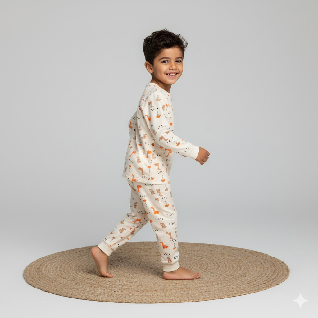 Snuggle up in this delightful two-piece pajama set featuring an adorable all-over dinosaur print. Designed for ultimate comfort and warmth during cozy nights and winter adventures.