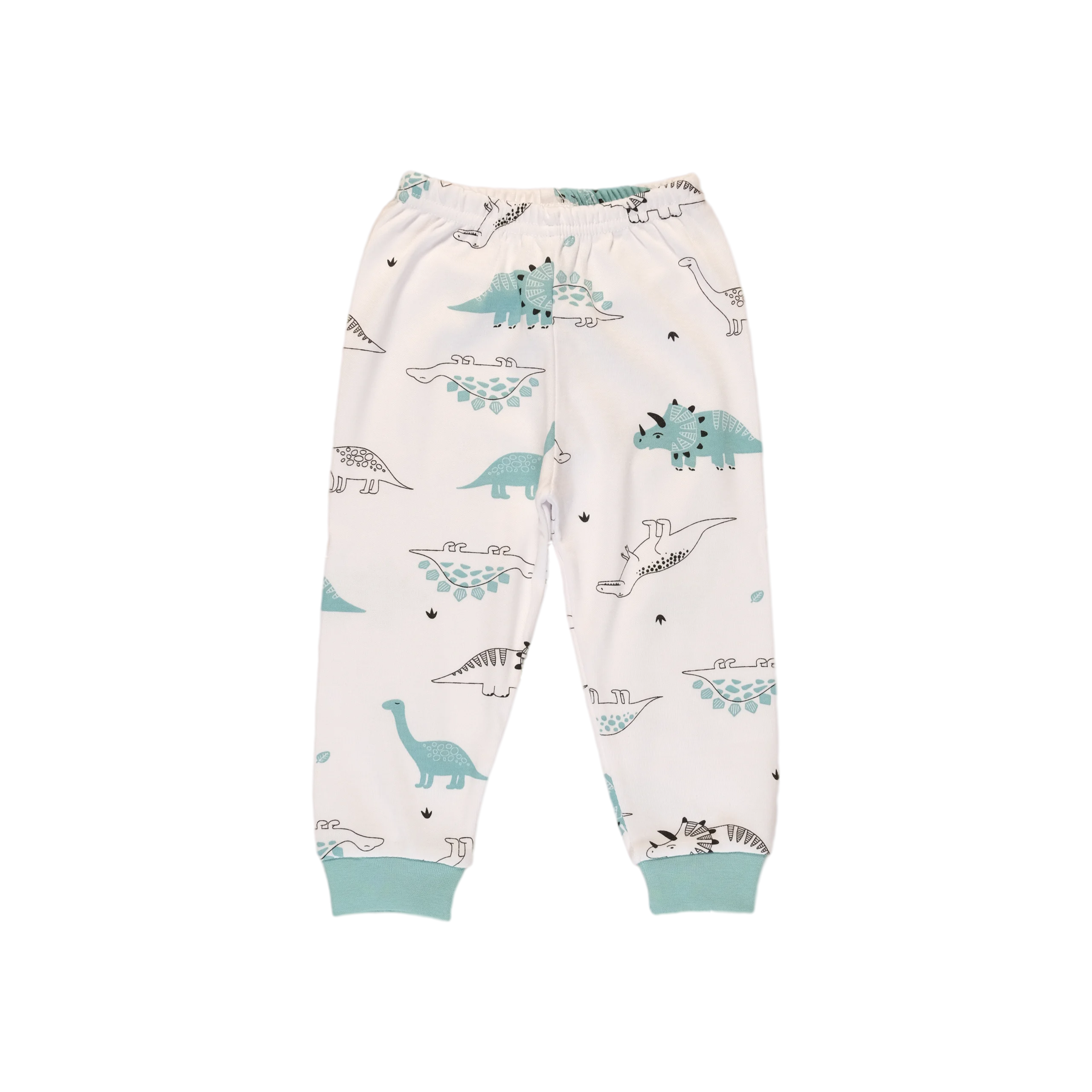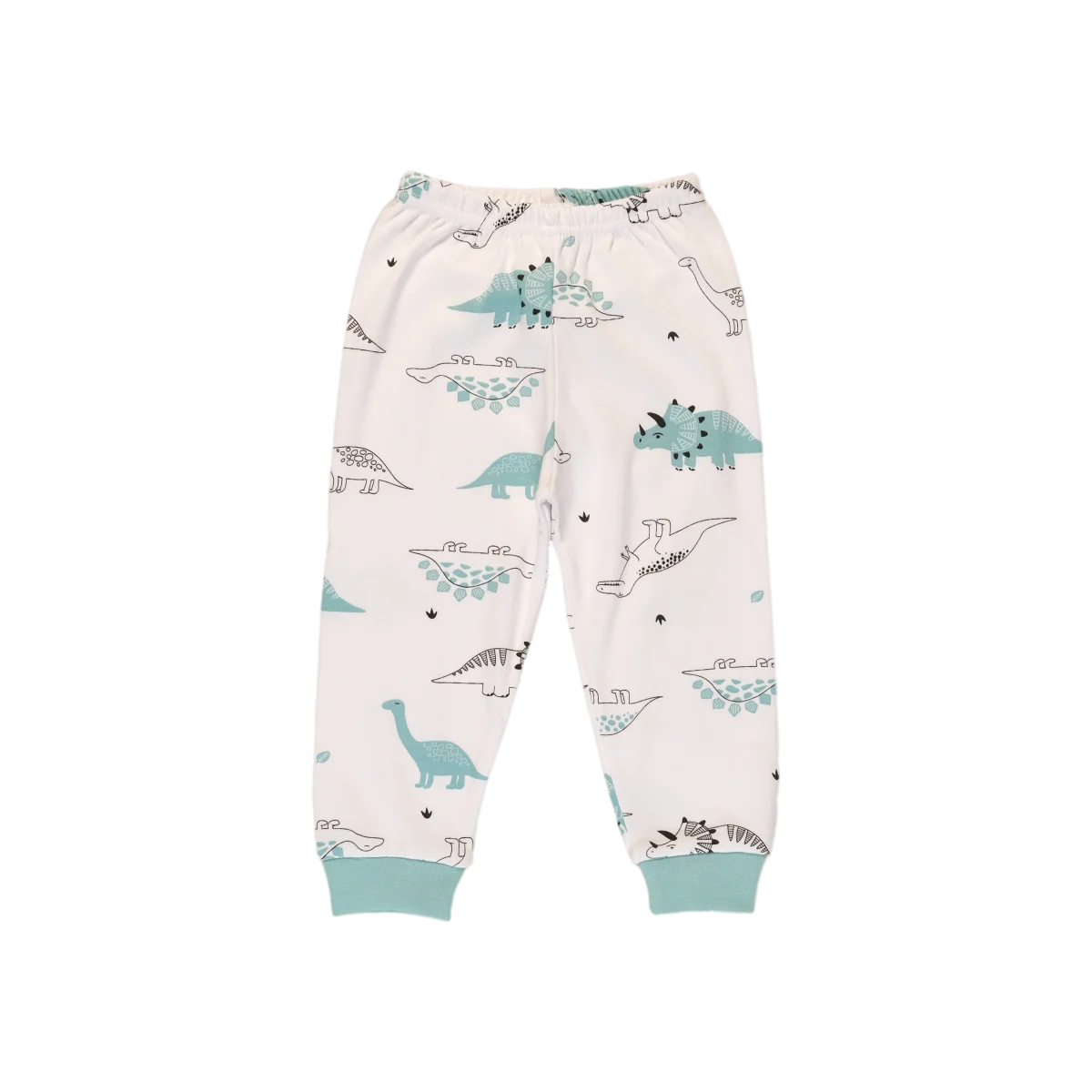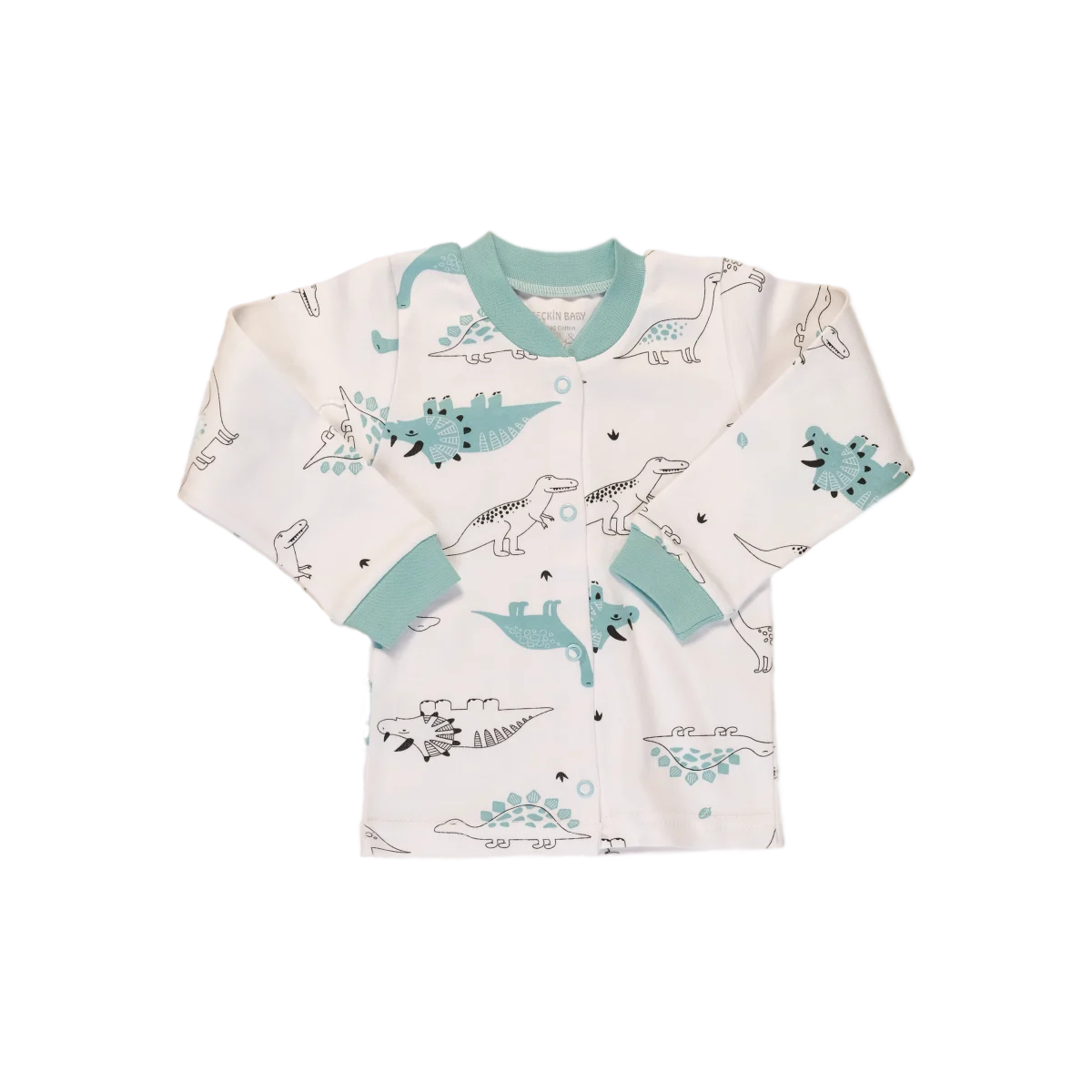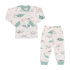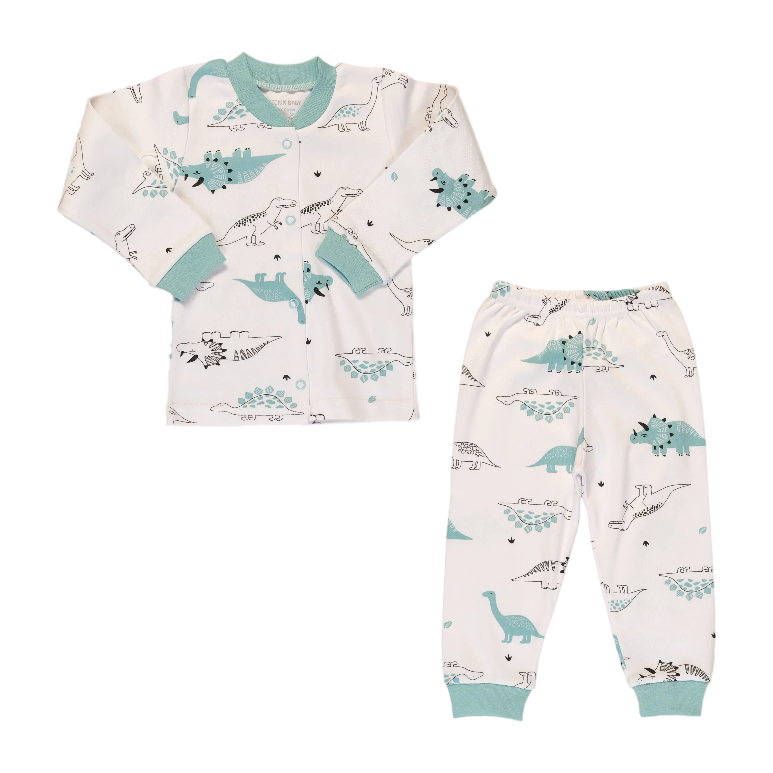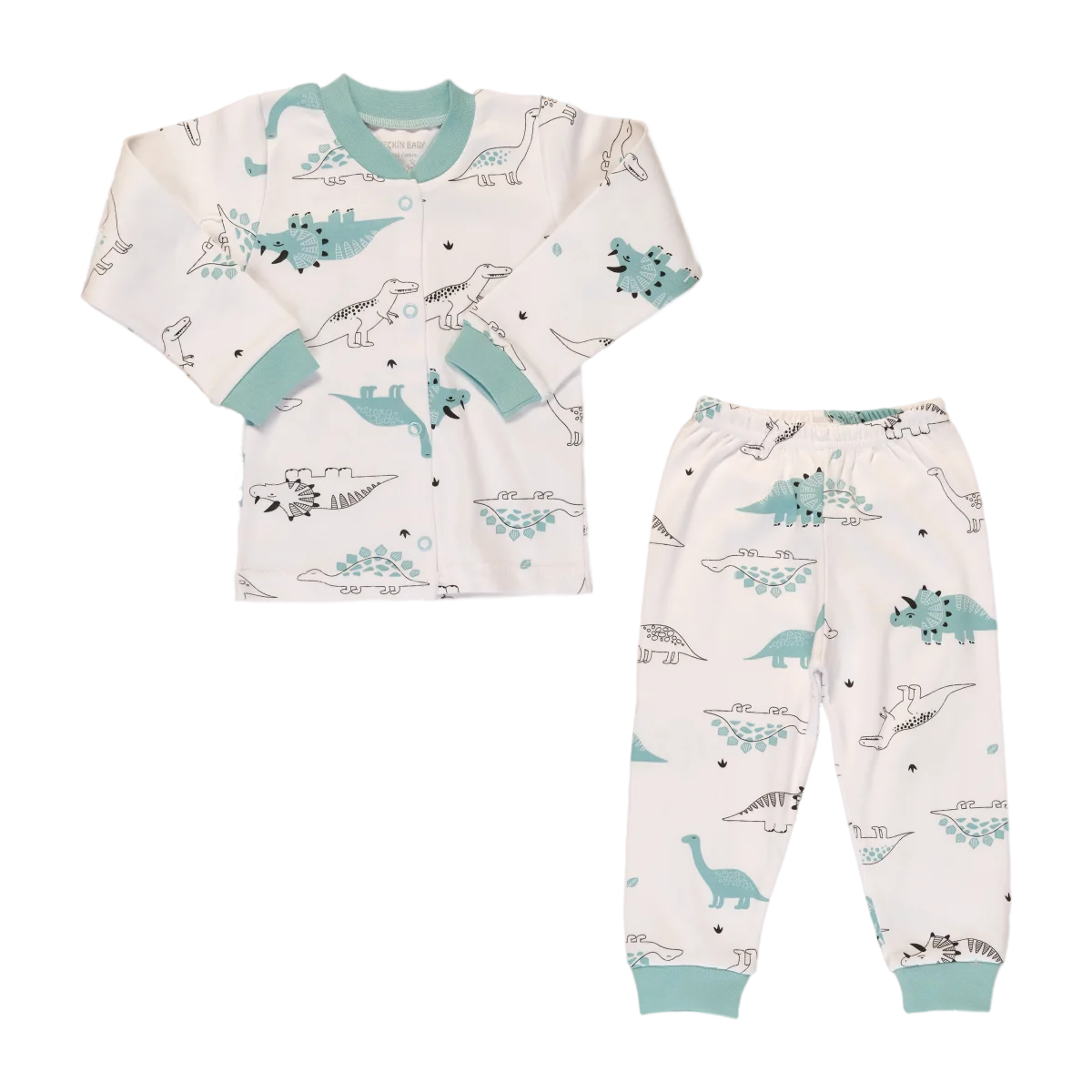 Let your little one dream of prehistoric adventures in this ultra-soft cotton pajama set, featuring adorable green dinosaurs and easy-to-use snap buttons for quick changes.