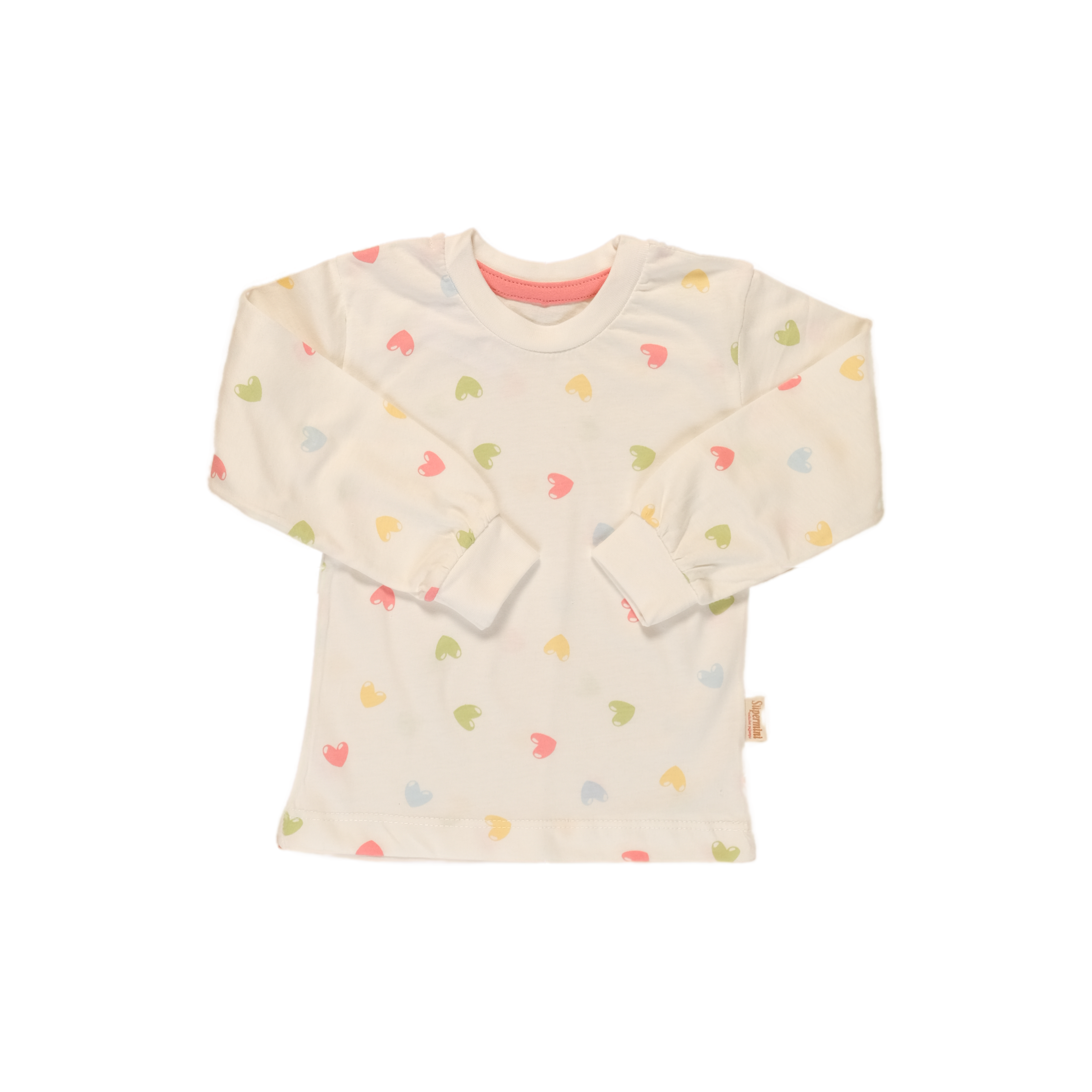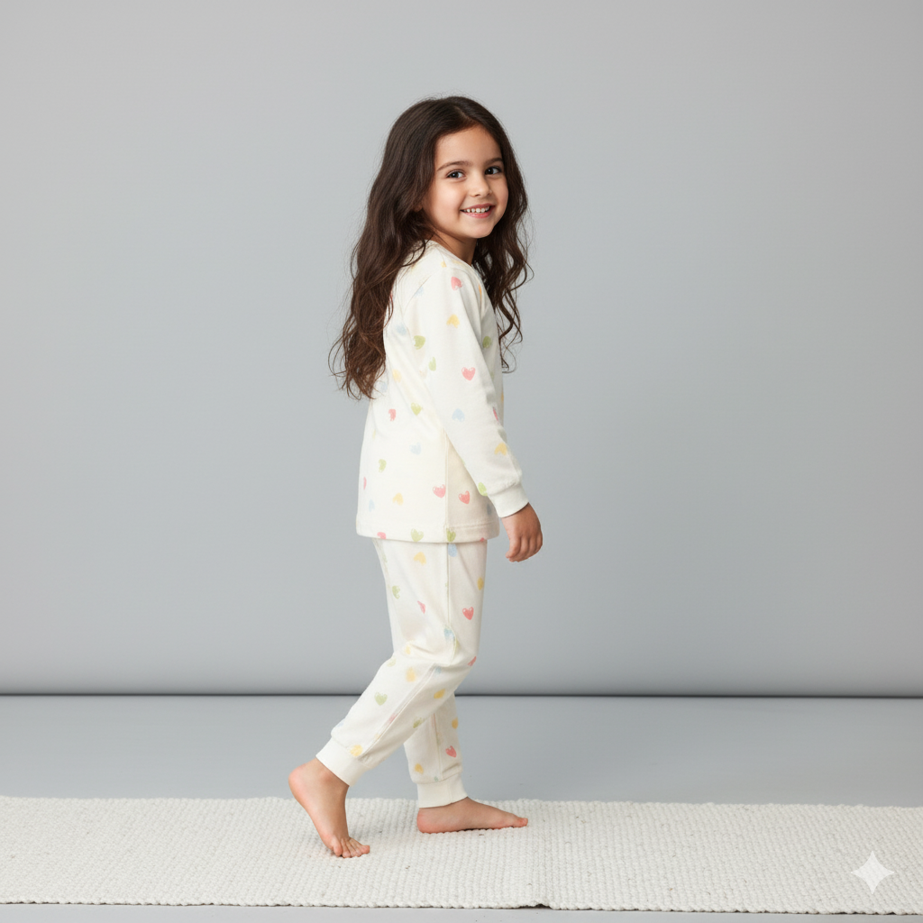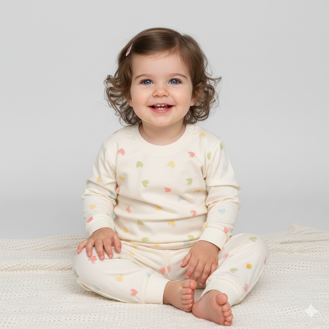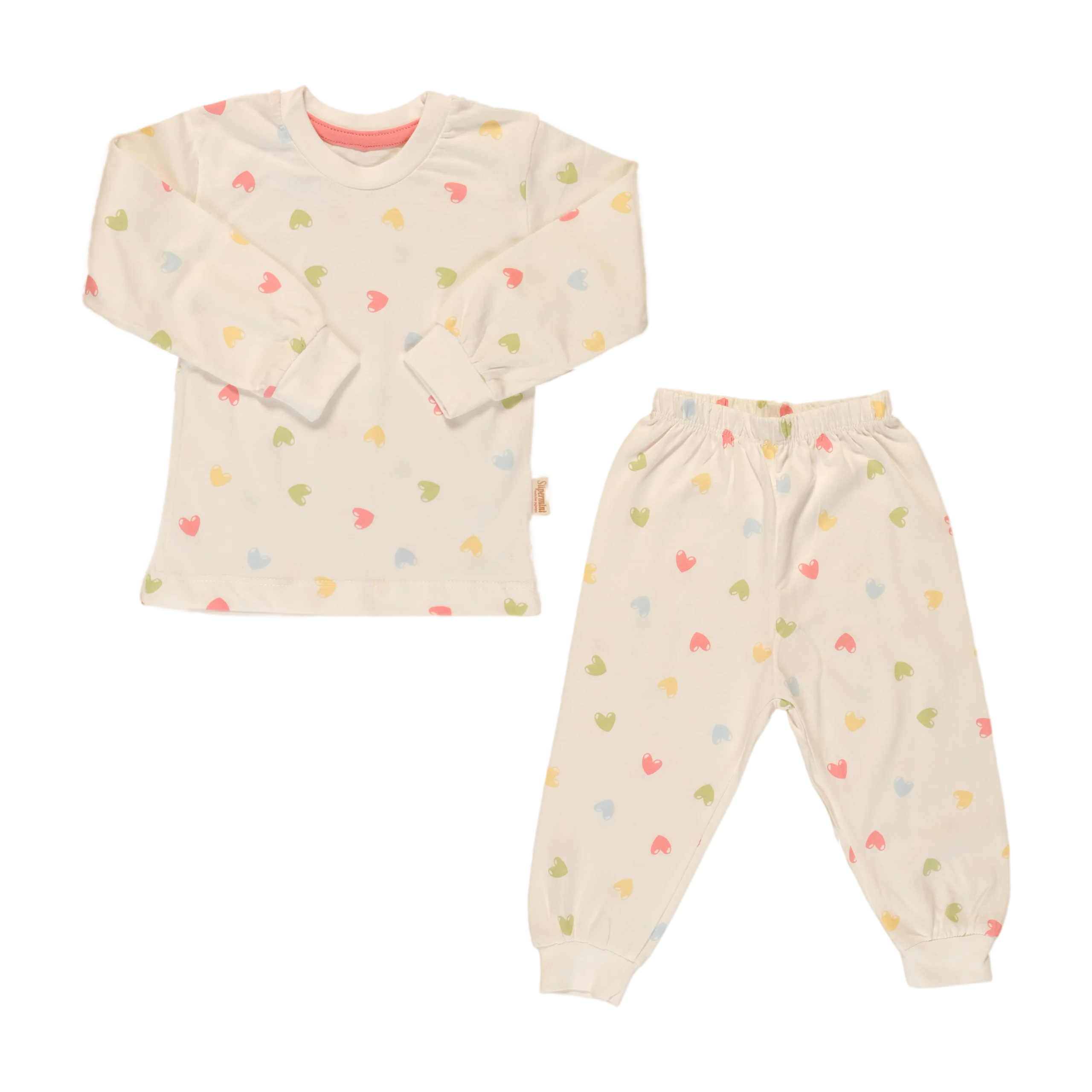 Wrap your little one in love with this adorable two-piece pajama set, featuring a charming pastel heart print on super-soft fabric, perfect for snuggling and sweet dreams.