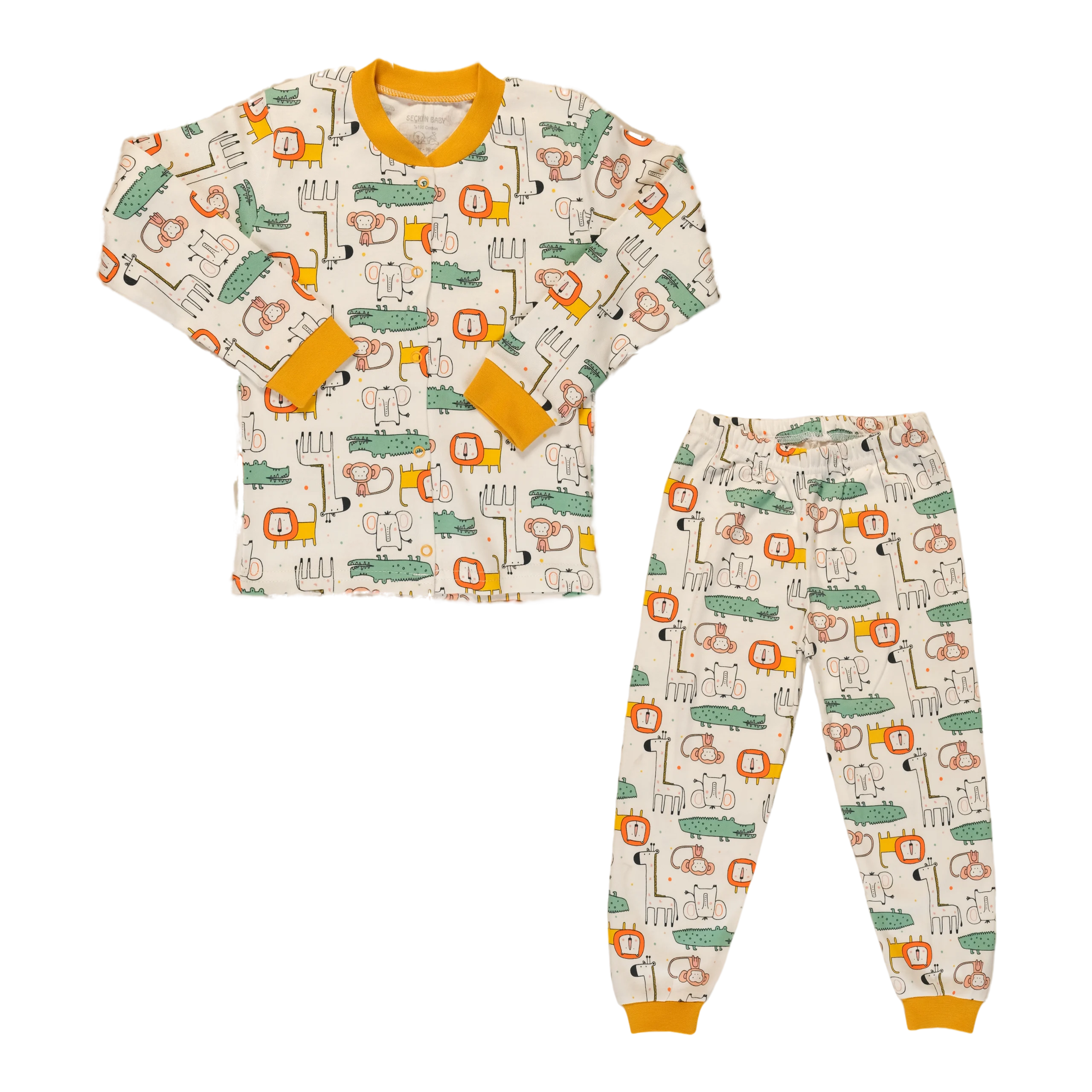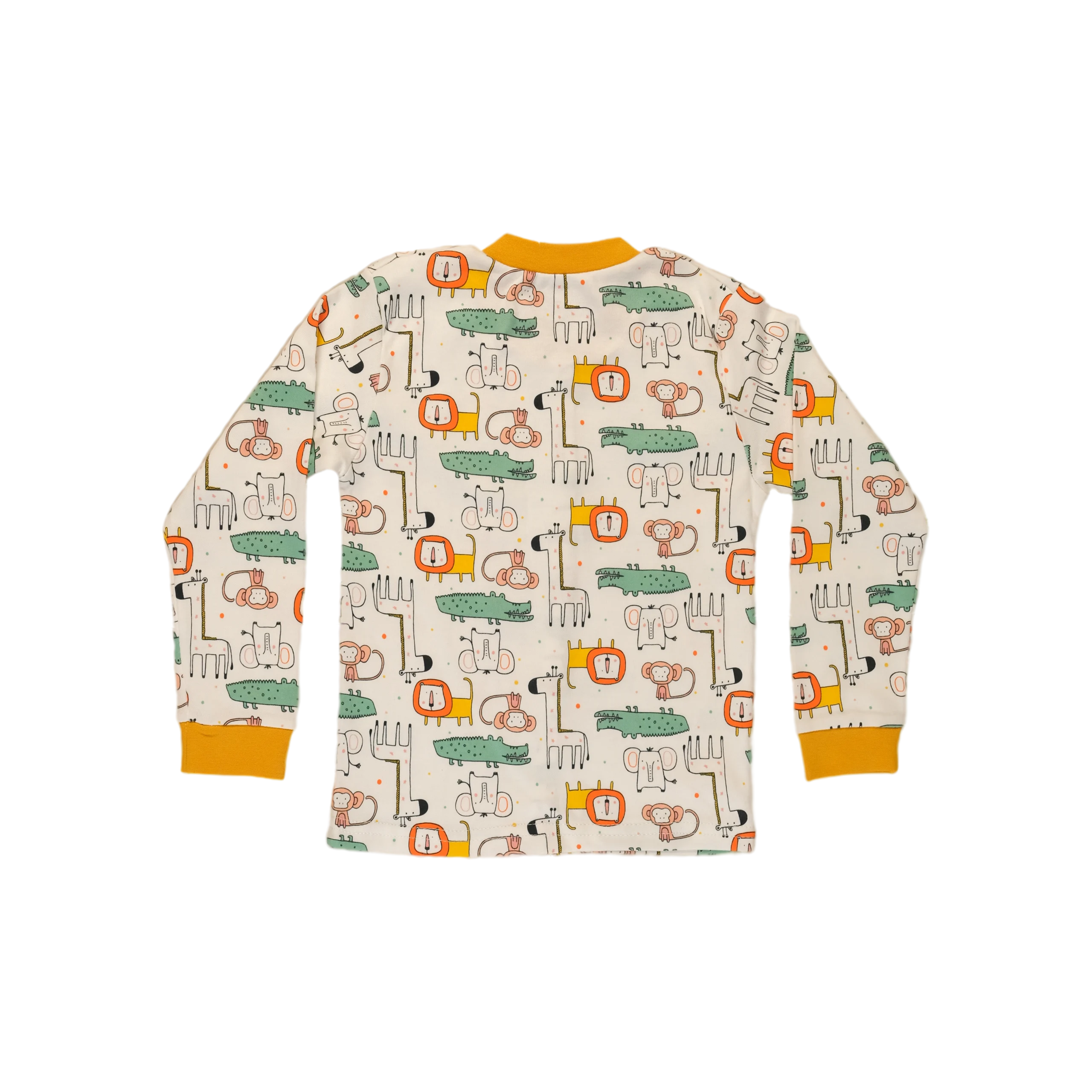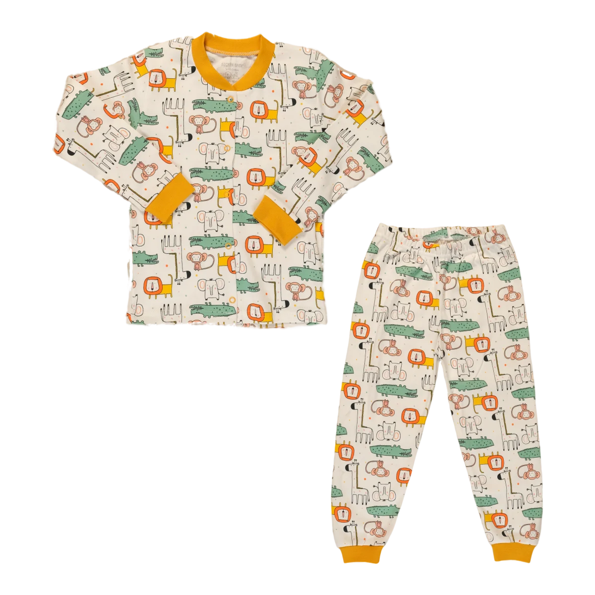 Snuggle up for dreamland adventures in this ultra-soft, 100% cotton pajama set featuring a cheerful mustard animal safari print and easy-wear snaps.