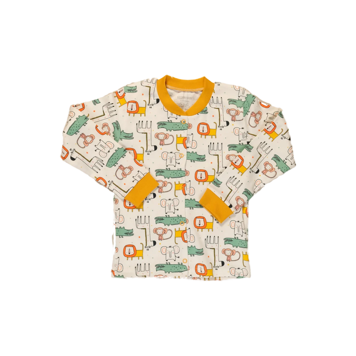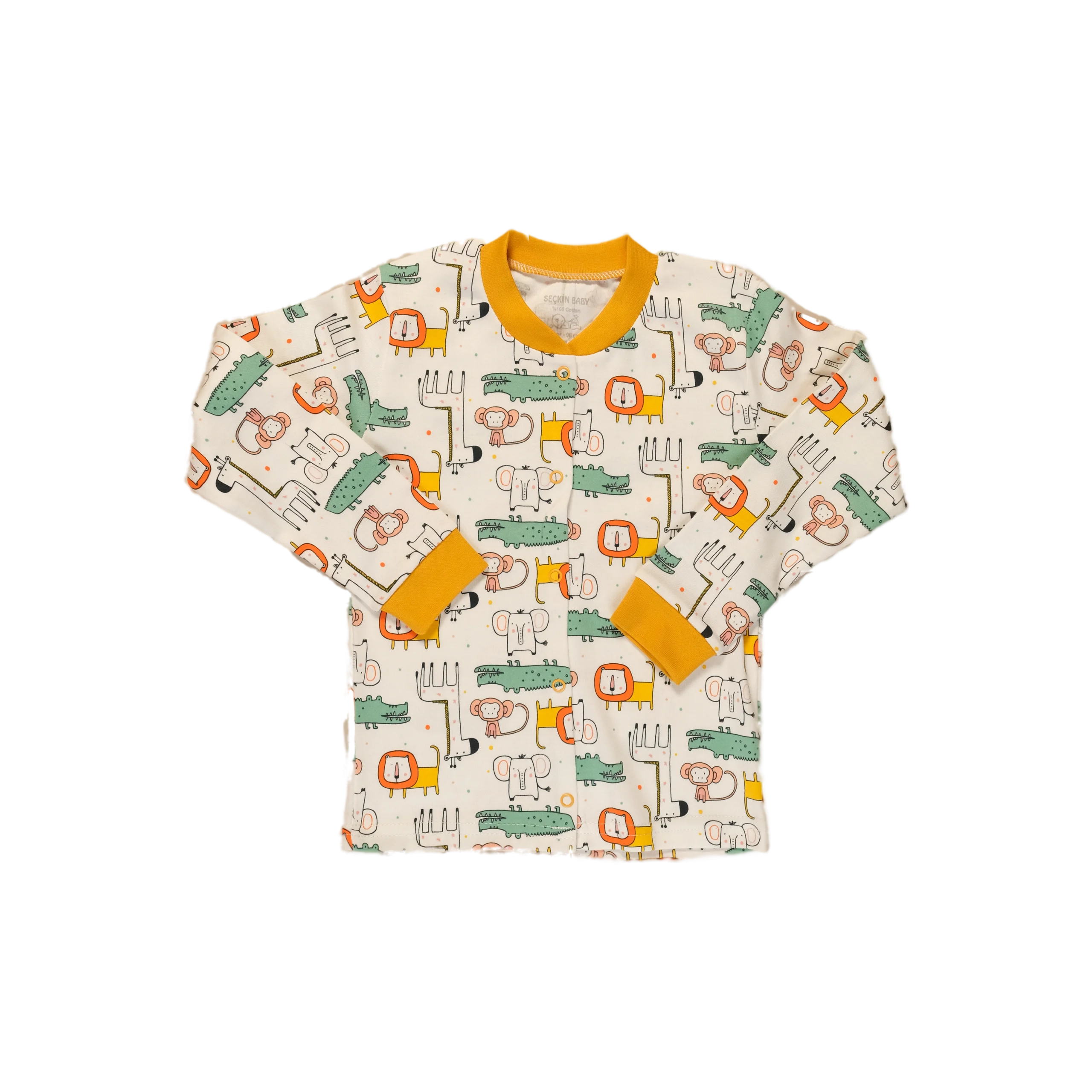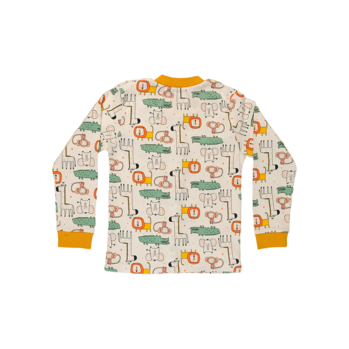 Snuggle up for dreamland adventures in this ultra-soft, 100% cotton pajama set featuring a cheerful mustard animal safari print and easy-wear snaps.