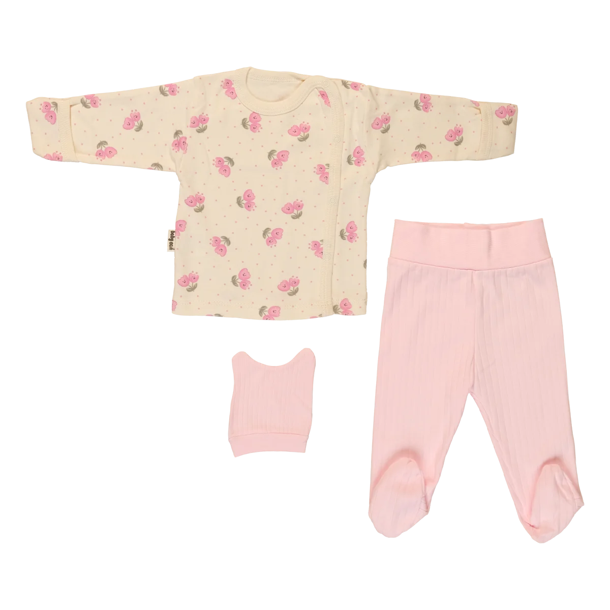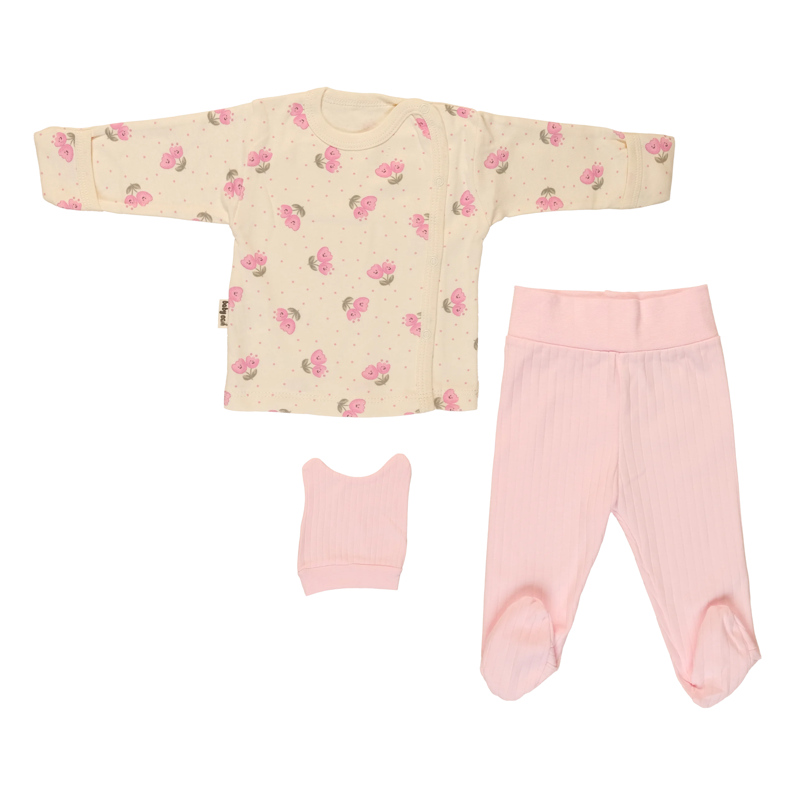 Dress your little one in cozy comfort with this beautiful 3-piece set featuring a charming dotted tulip print top and soft ribbed pants. Essential for newborns, this set offers easy changing and adorable style for everyday wear.