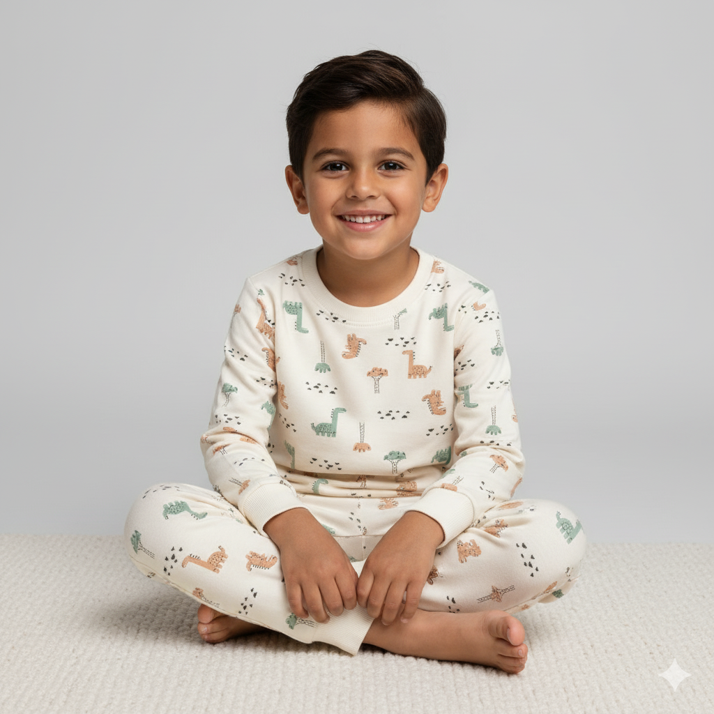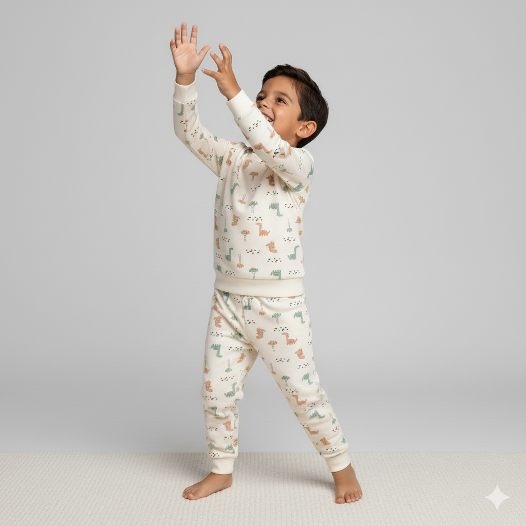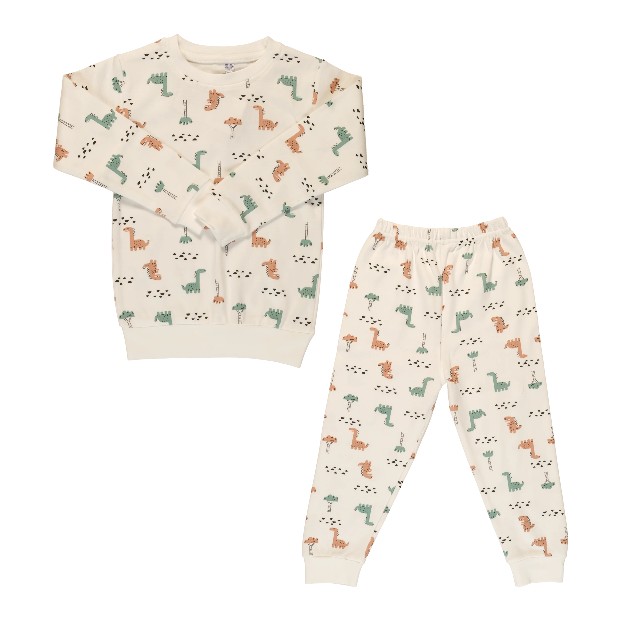 Blottissez-vous dans ce charmant ensemble de pyjama deux pièces arborant un adorable imprimé de dinosaures. Conçu pour un confort et une chaleur optimaux pendant les nuits douillettes et les aventures hivernales.